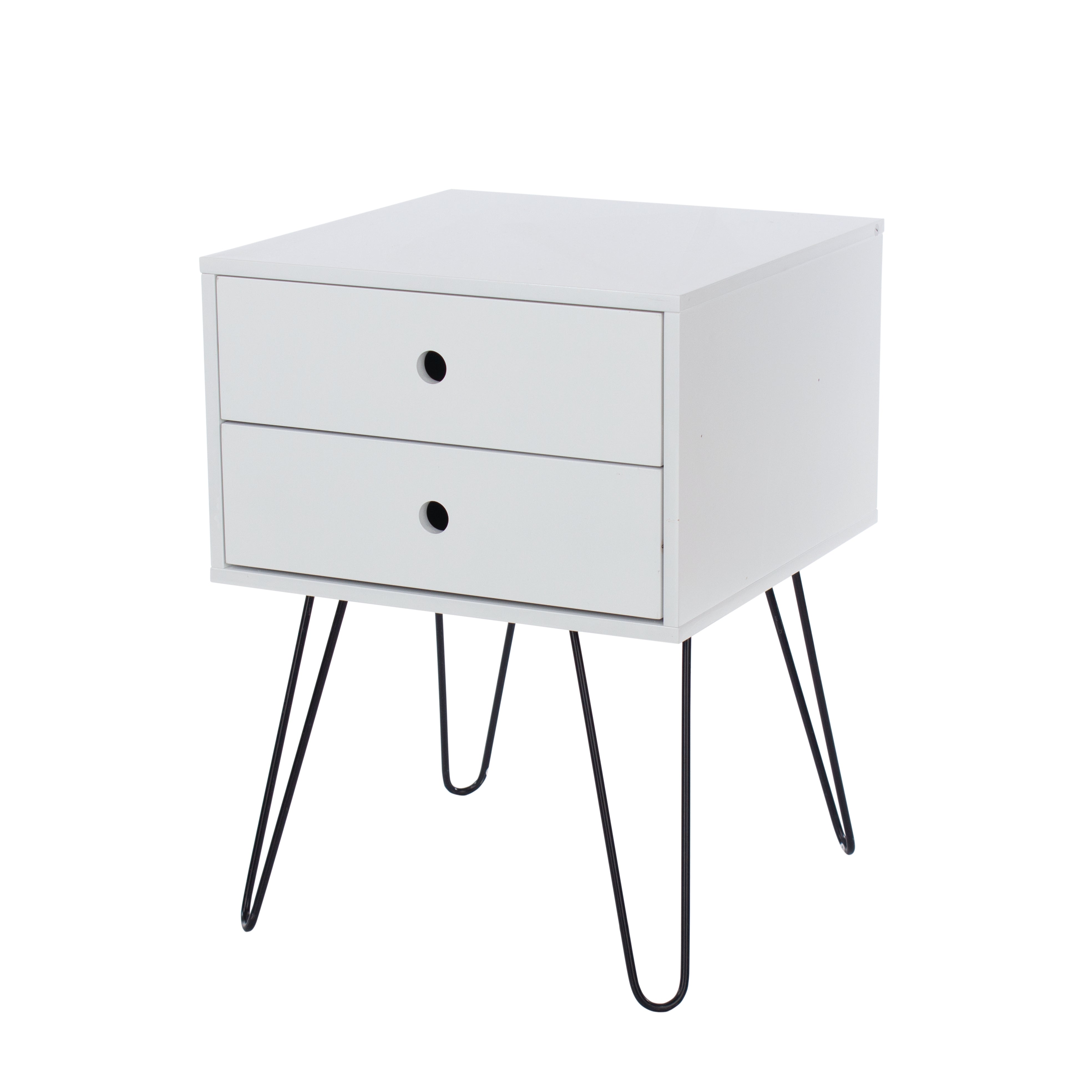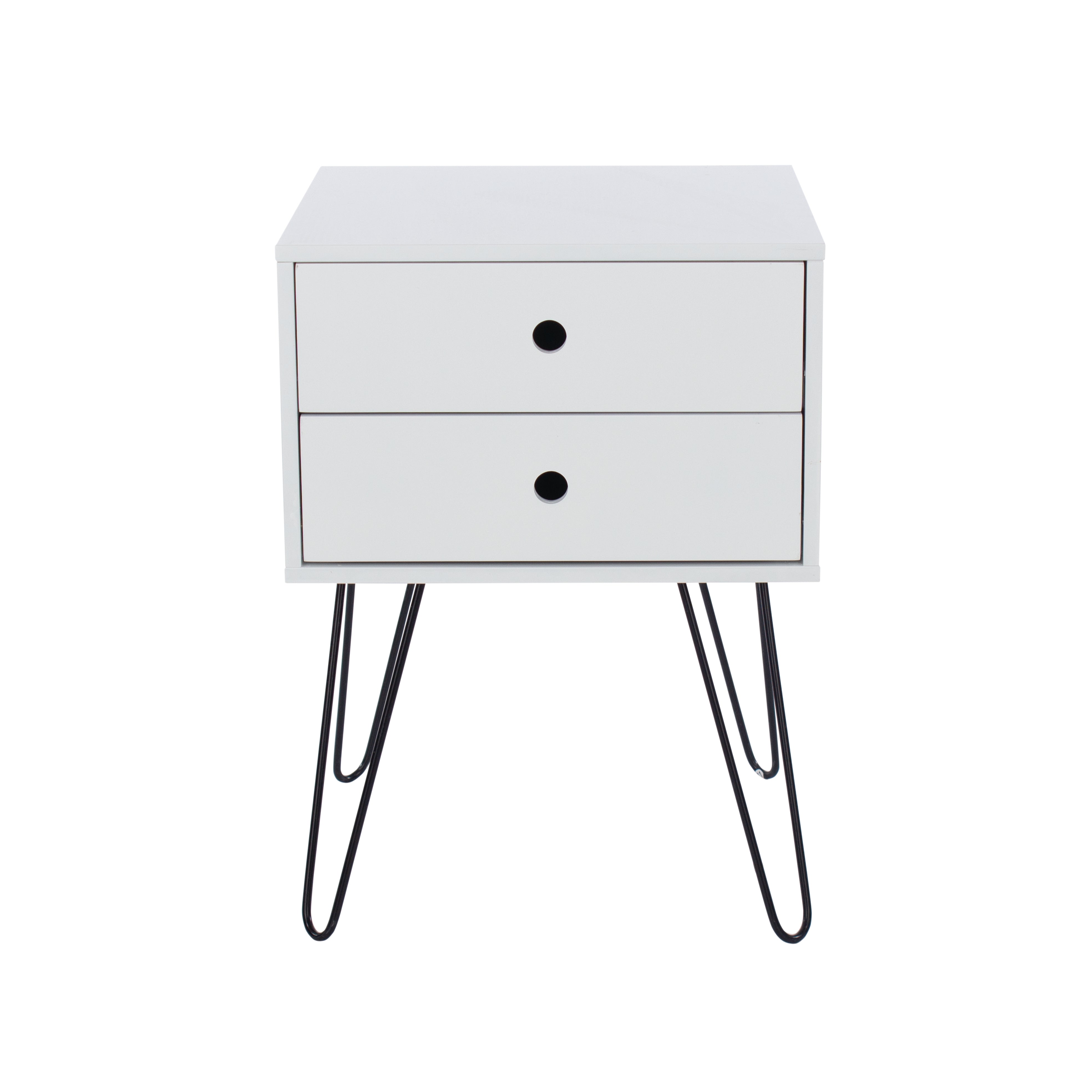 Finished in white with contrasting black metal legs, this bedside cabinet is made from durable MDF, metal, and melamine for lasting use.