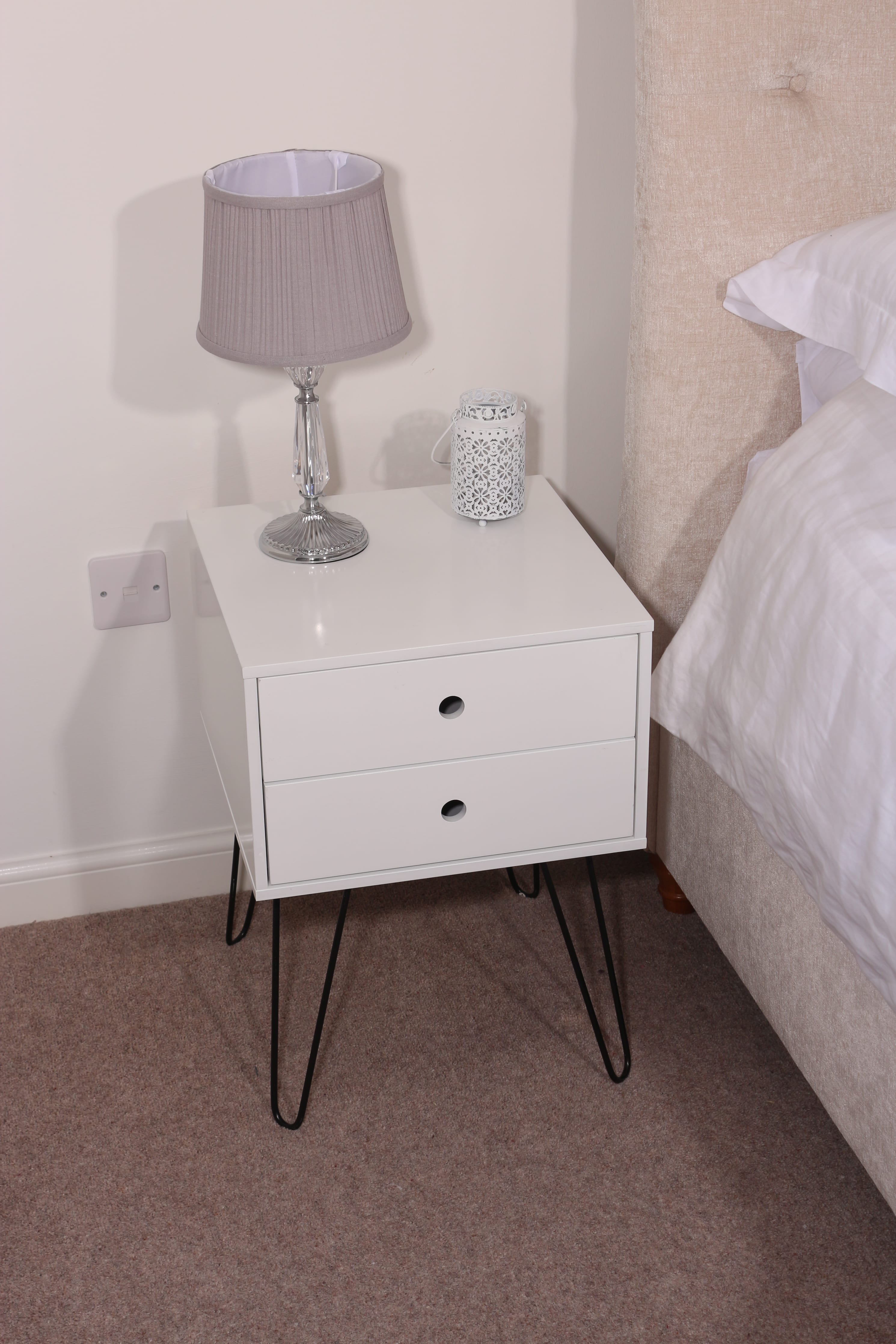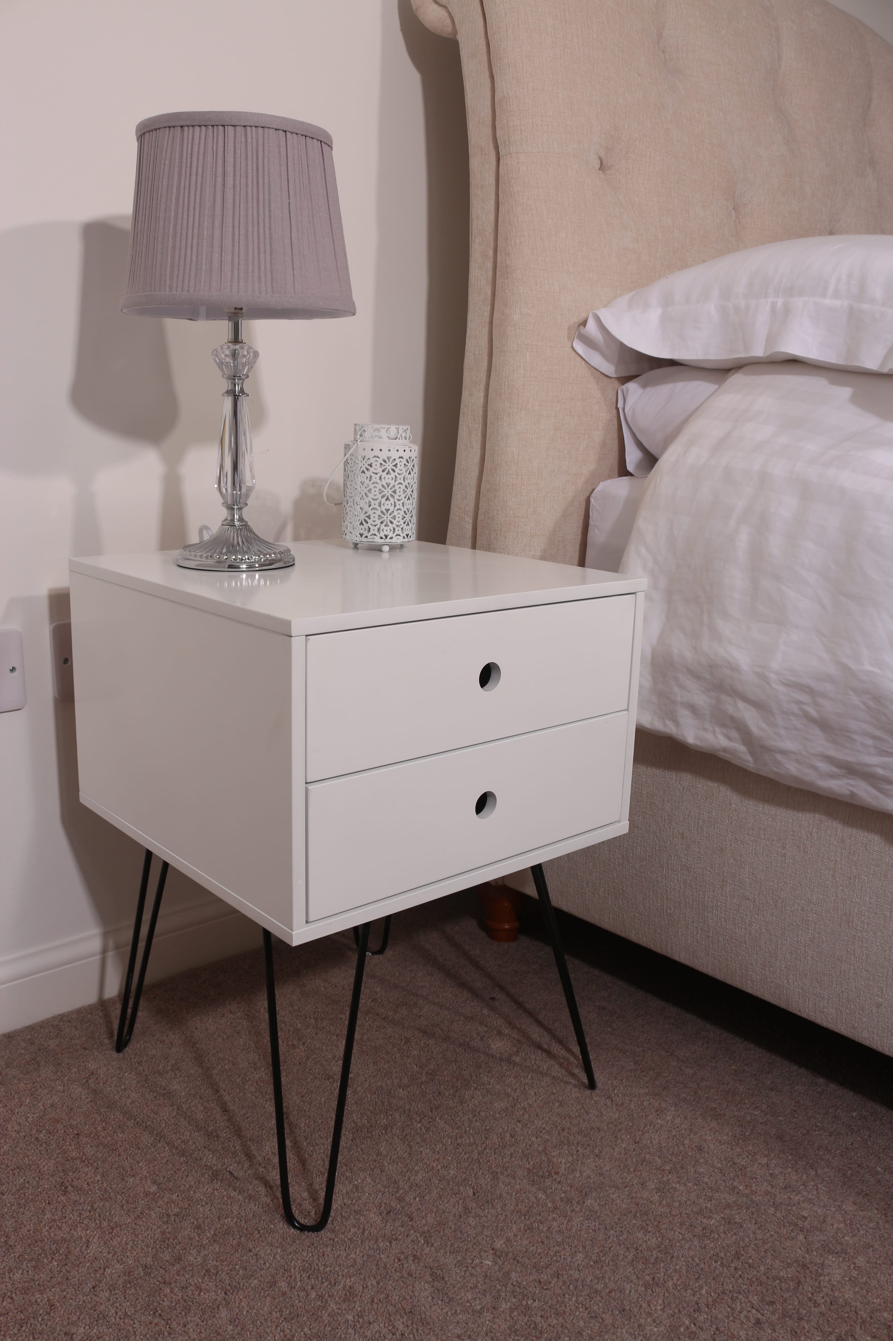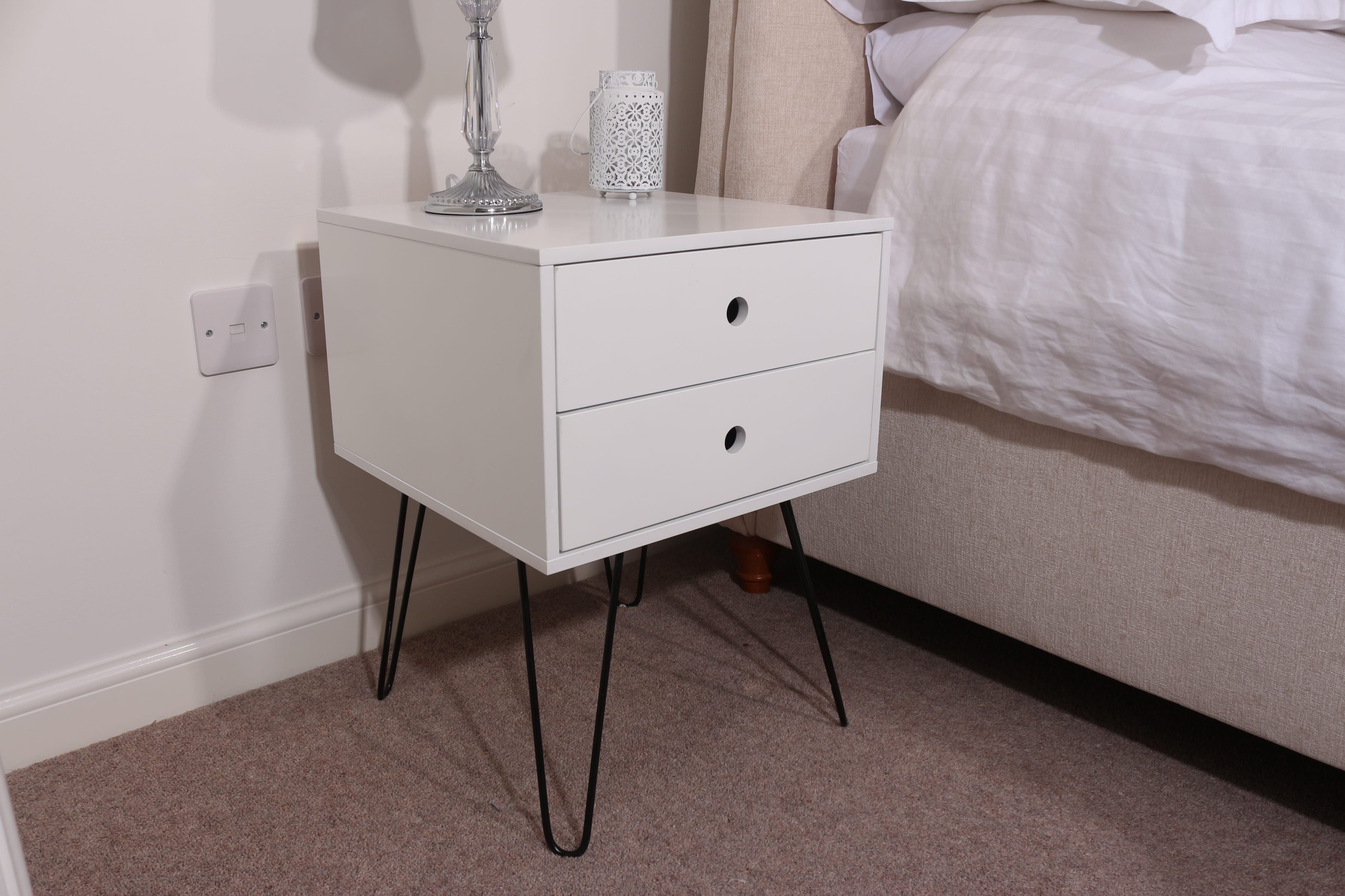 This contemporary styled white painted bedside features a 2 drawer cabinet with finger apertures on angular black metal legs, perfect for a modern compact bedroom.