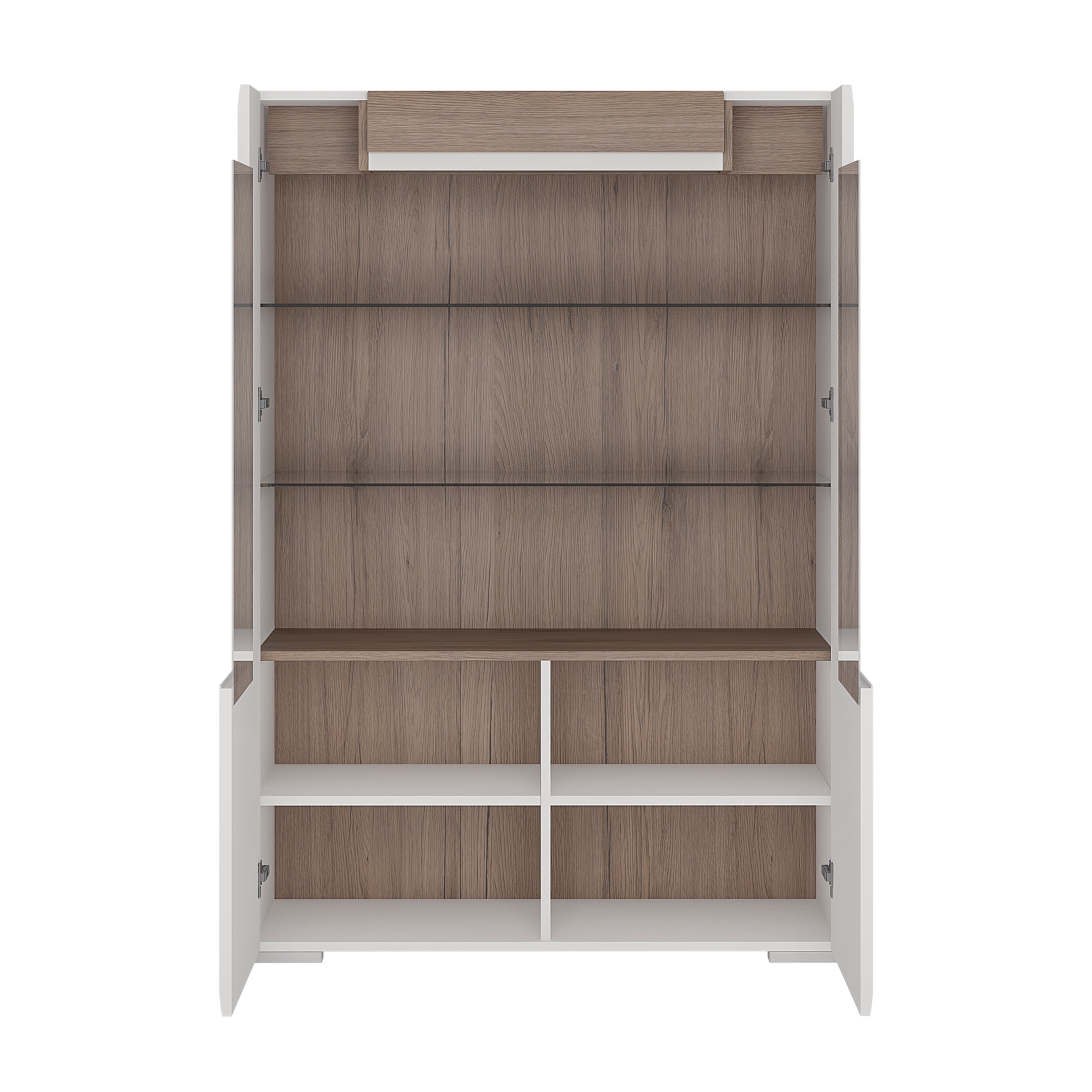 Enhance your living or dining space with the Toronto Low Glazed 2 Door Display Cabinet, featuring soft close doors, internal LED lighting, and adjustable shelves for stylish and practical storage.