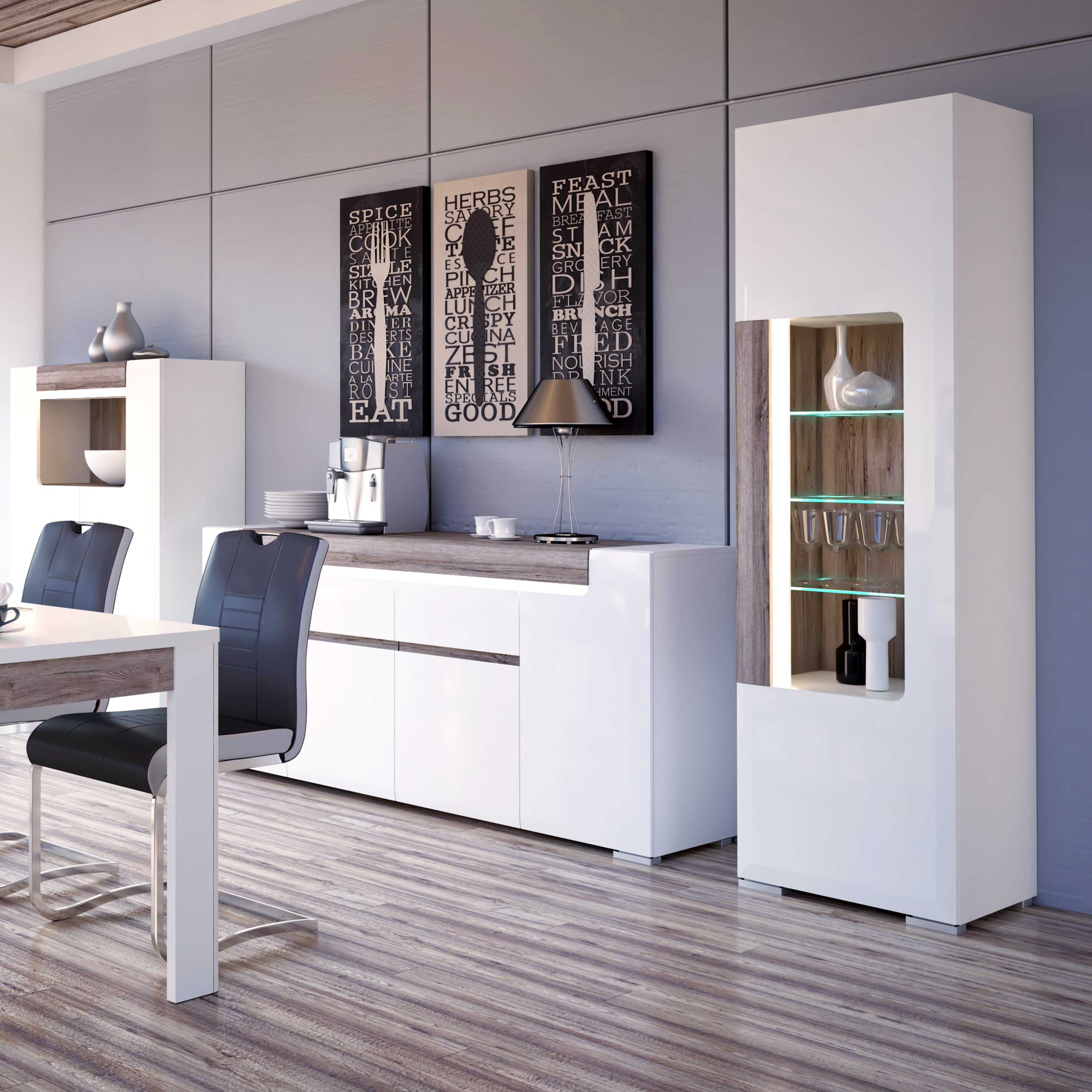 Finished in White High Gloss with San Remo Oak inset, combining warm and cool tones for a contemporary living and dining collection.