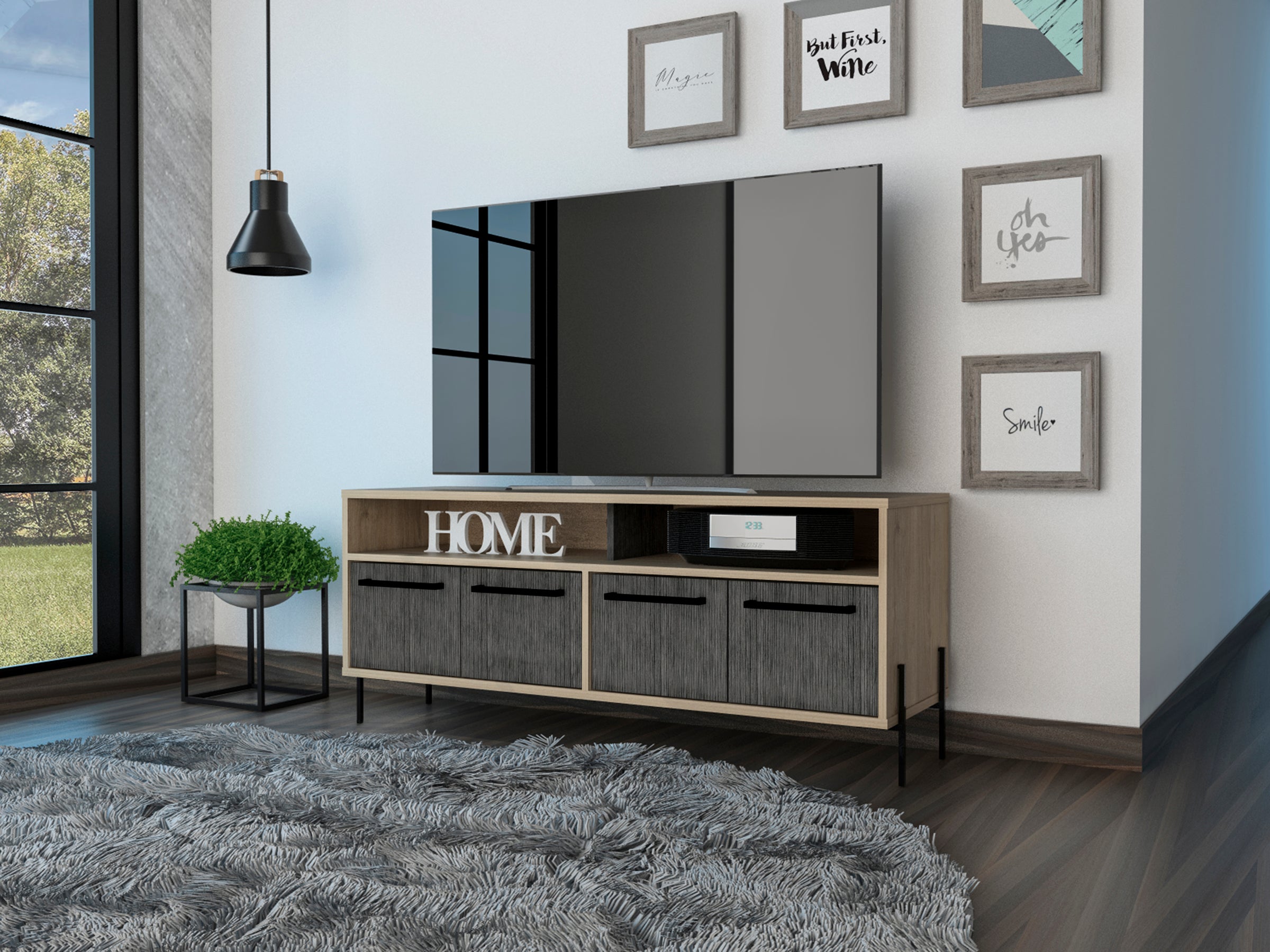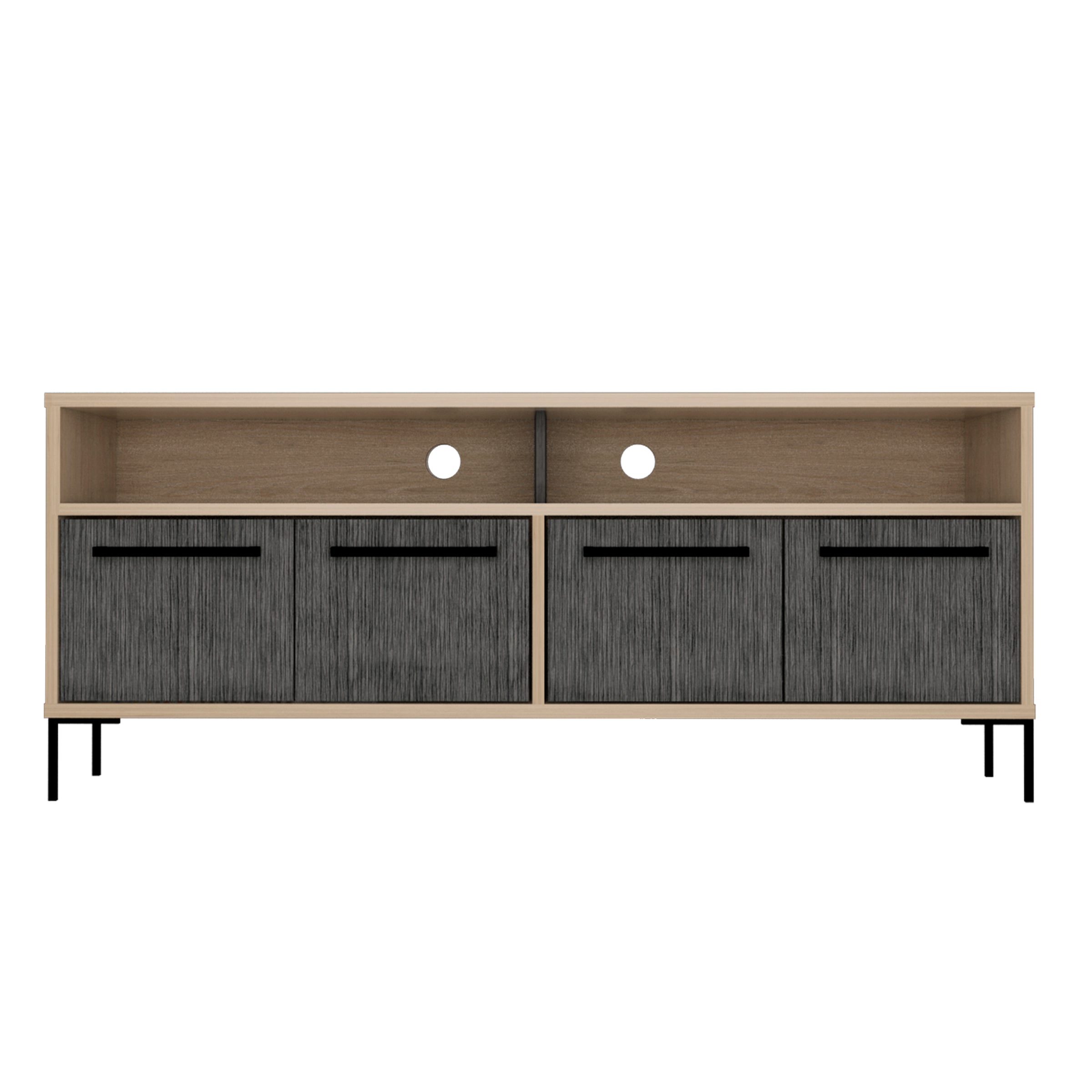 This wide screen TV unit accommodates up to a 55" television with ample open storage for gadgets along with extra storage space enclosed behind four doors. Crafted in a hardwearing, easy to clean washed oak and carbon grey oak effect melamine finish with real metal hardware, it is perfect for modern living spaces.