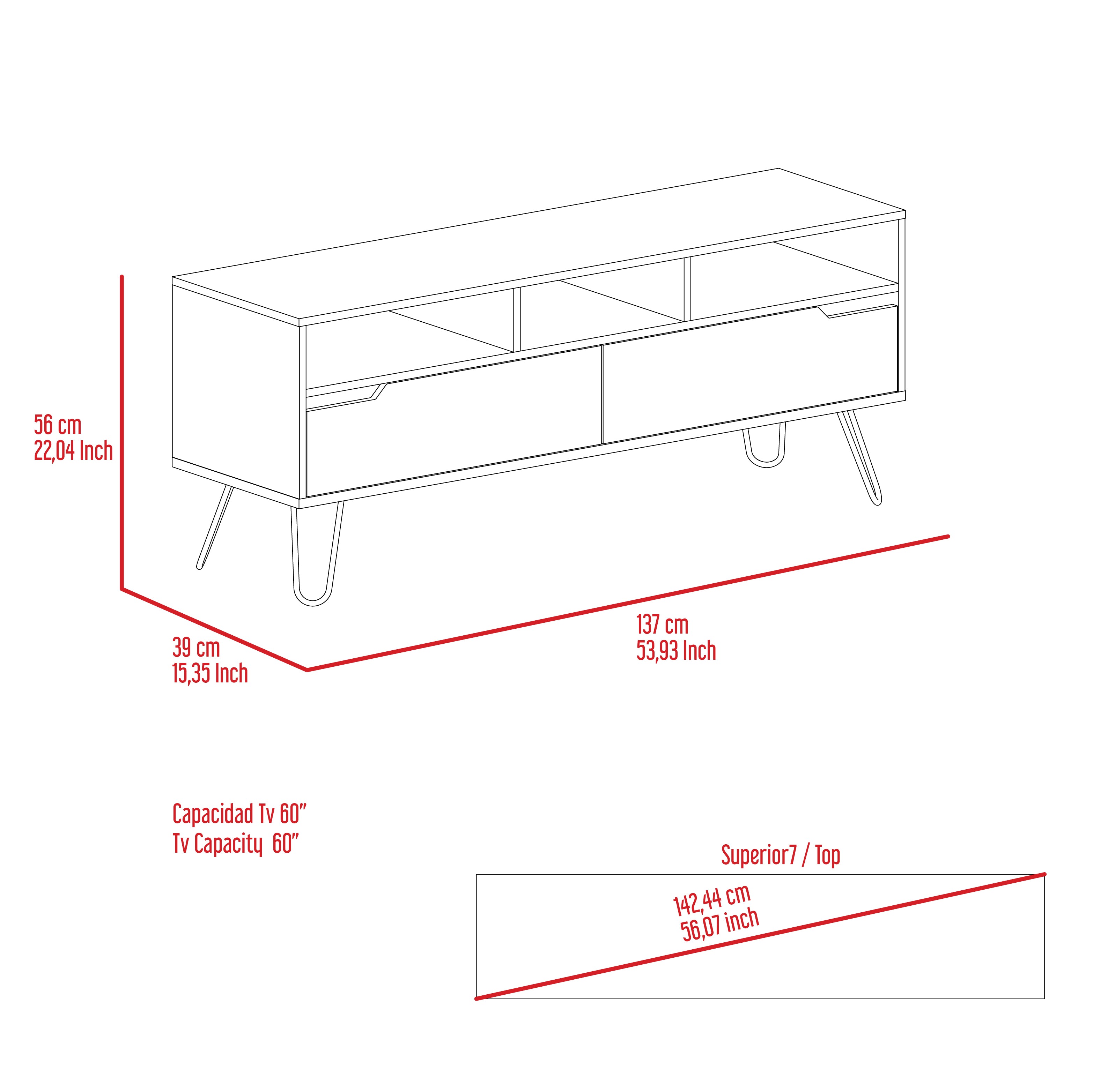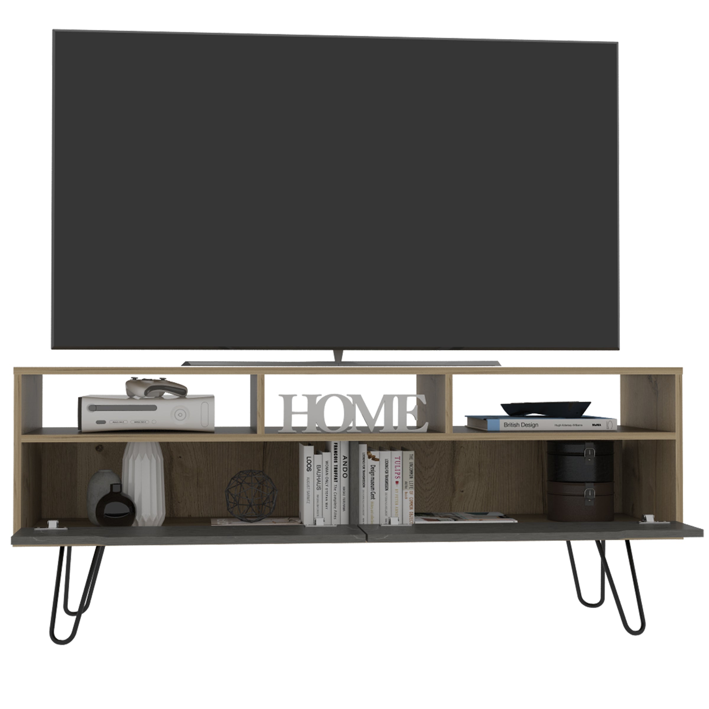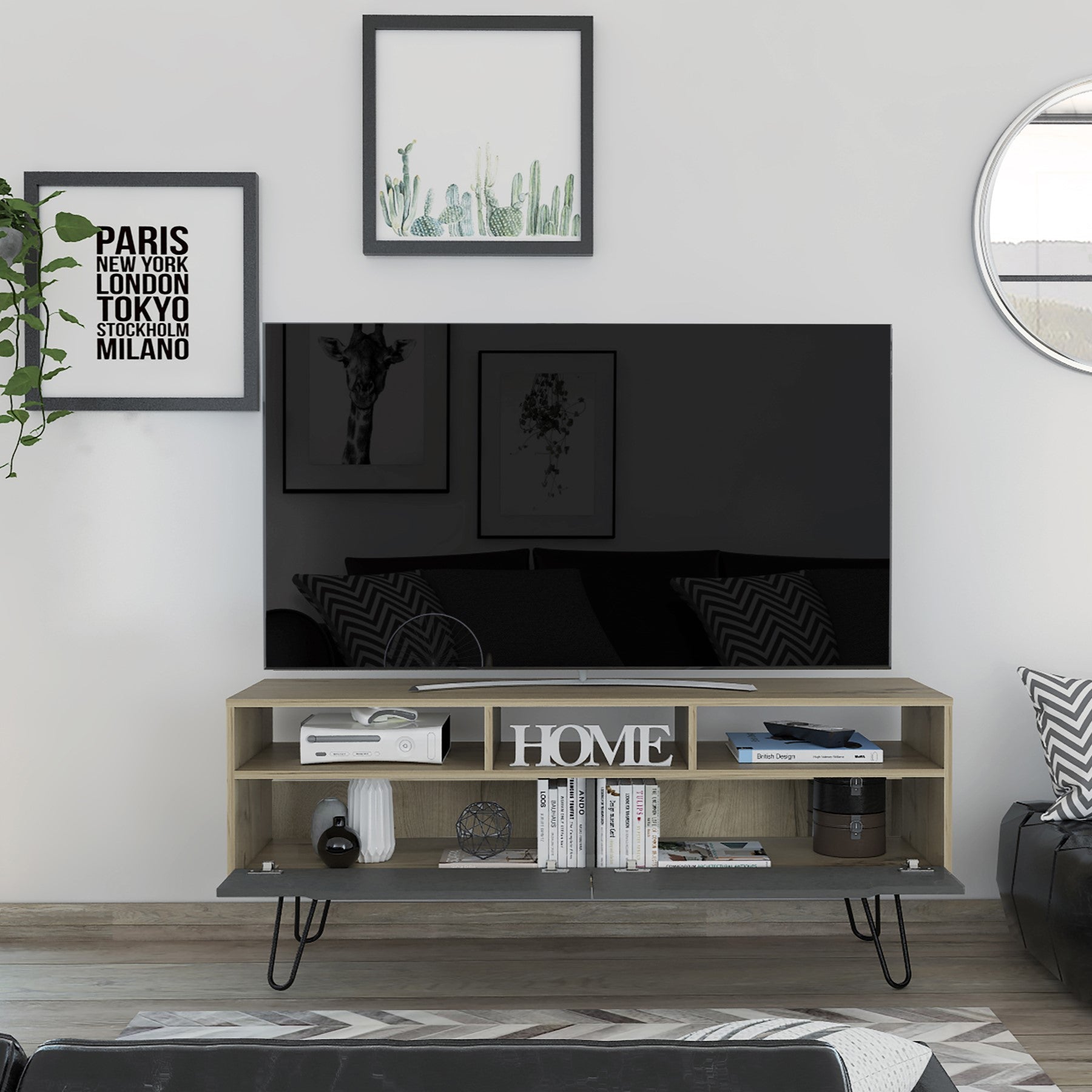 This TV unit can accommodate up to a 56" screen with ample open space for your gadgets and additional concealed storage behind three drop-down doors. Finished in a bleached pine and grey stone effect melamine with sturdy real metal hairpin legs, it combines style and practicality.